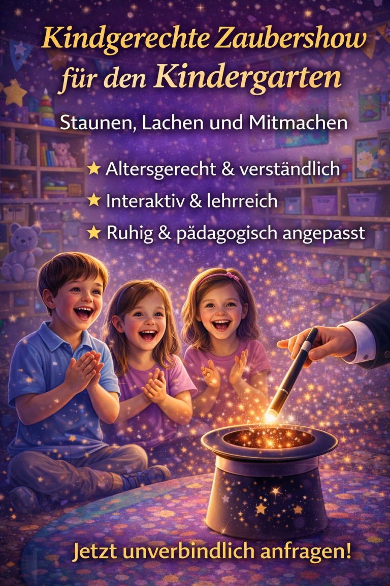 Die Zaubershow für Kitas ist altersgerecht aufgebaut und lädt die Kinder zum Staunen, Lachen und Mitmachen ein – ruhig, verständlich und mit viel Feingefühl für die Bedürfnisse von Vorschulkindern.